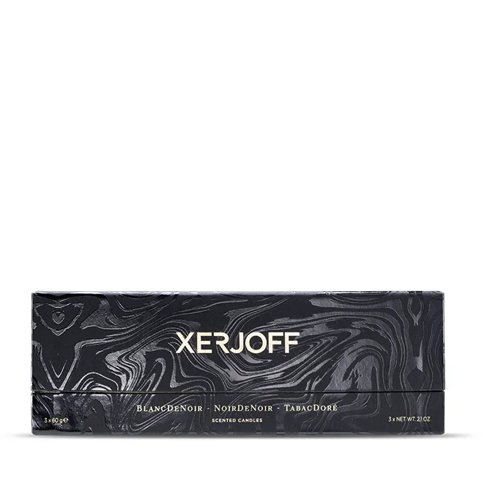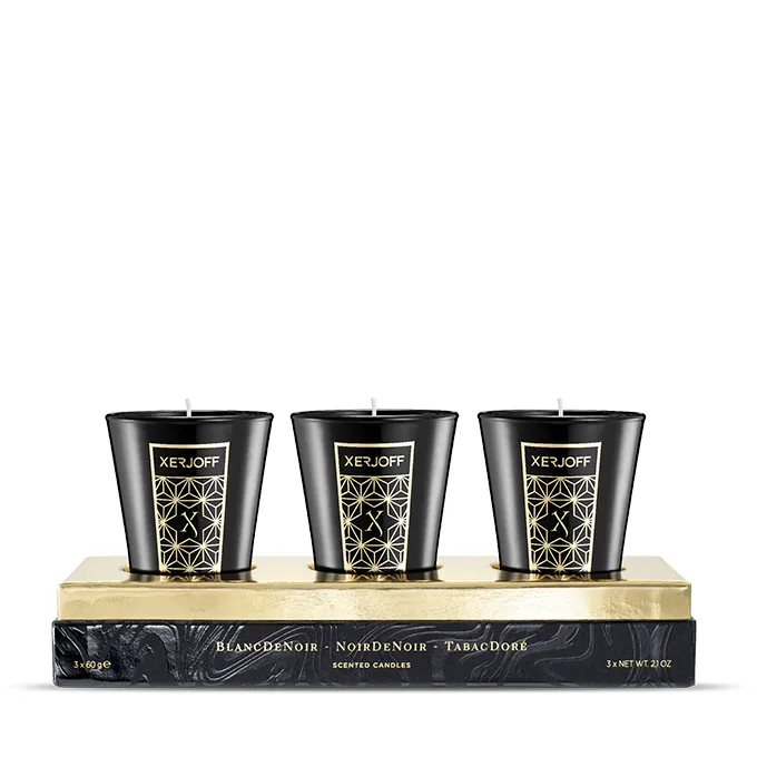 Il set Black Scented Candles della collezione Xerjoff Scentimento invita a esplorare il mondo attraverso tre fragranze affascinanti: TobacDorè, NoirDeNoir e BlancDeNoir.